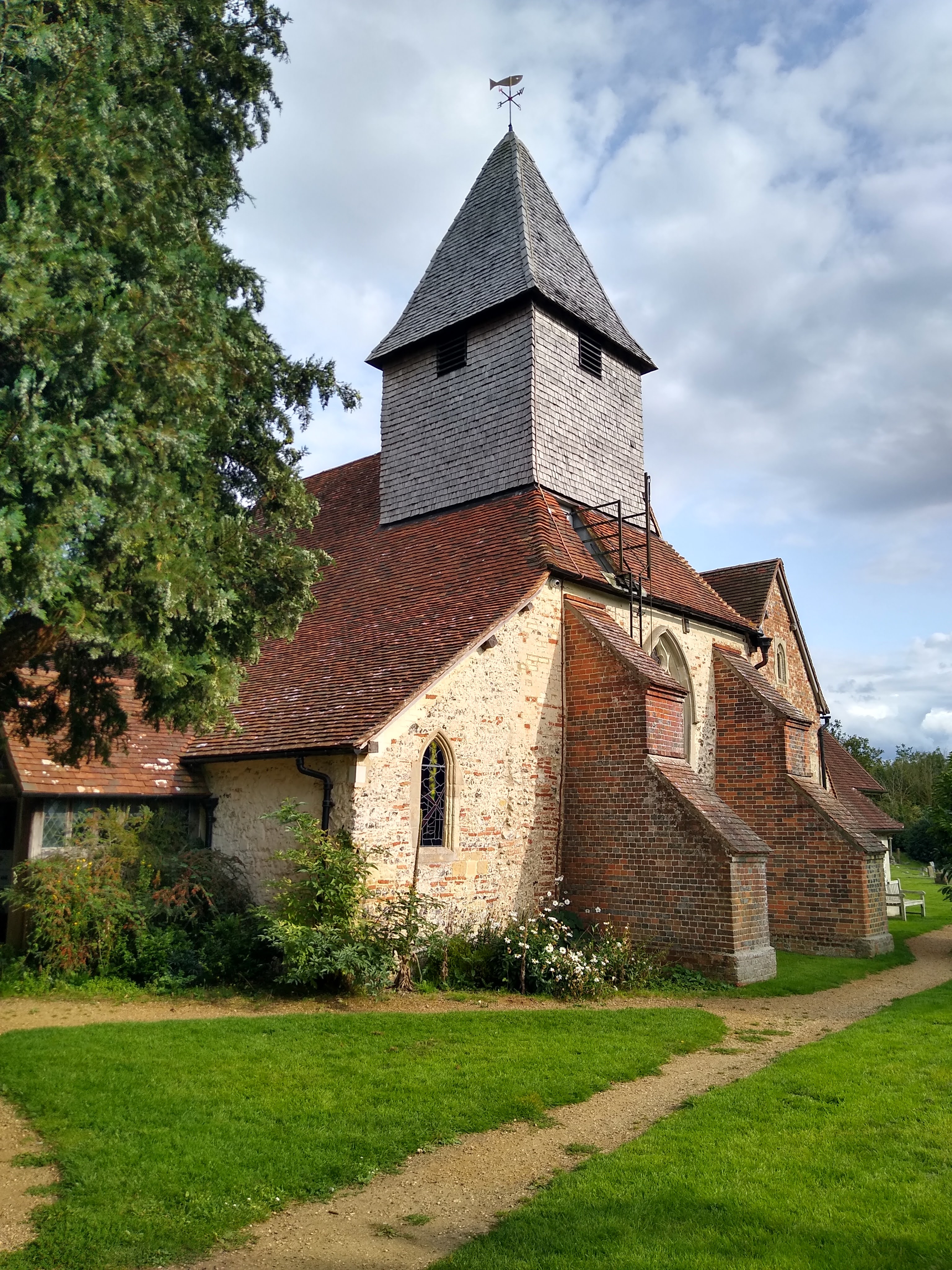 There were highlights. The Church of St Mary the Virgin at the halfway point on Day 1 – a beautiful 12th-century building with painted decoration of the walls that seems to have been spared the reformation. Rejoining the way on the same day after a detour and finding the Berkshire/Hampshire county border like the parish boundaries on the Hammars o Syradale. The Quaker cemetery in Basingstoke whose centrepieces are the shells of ruined chapels and whose winding path is paved with prostrate graves.
