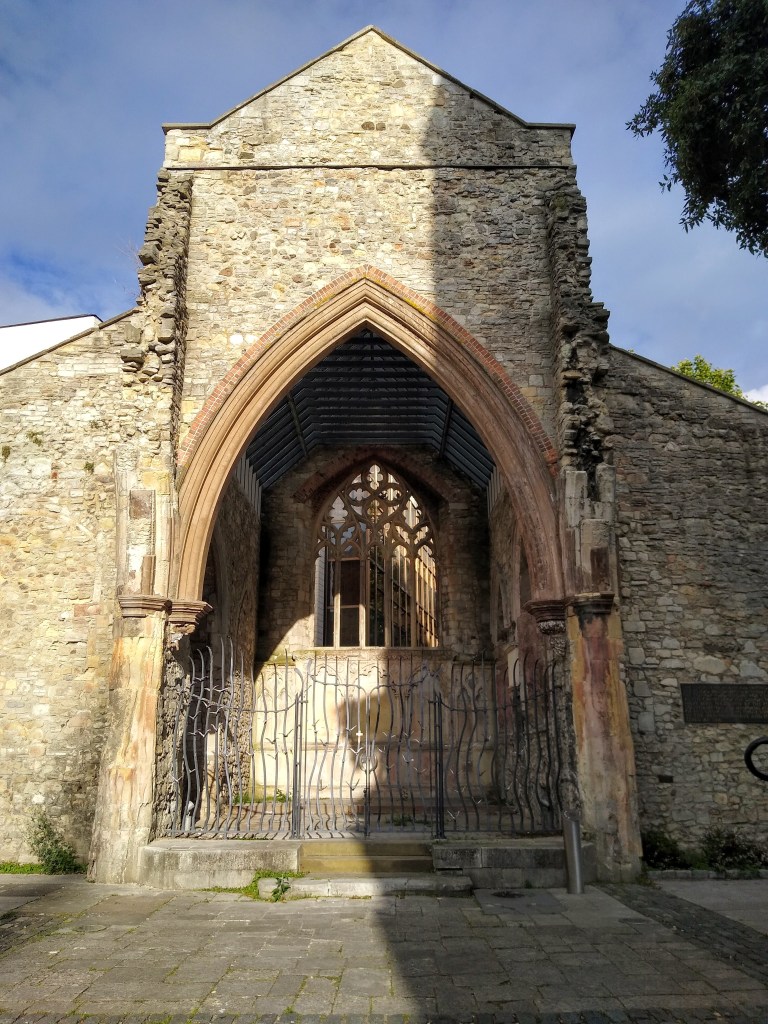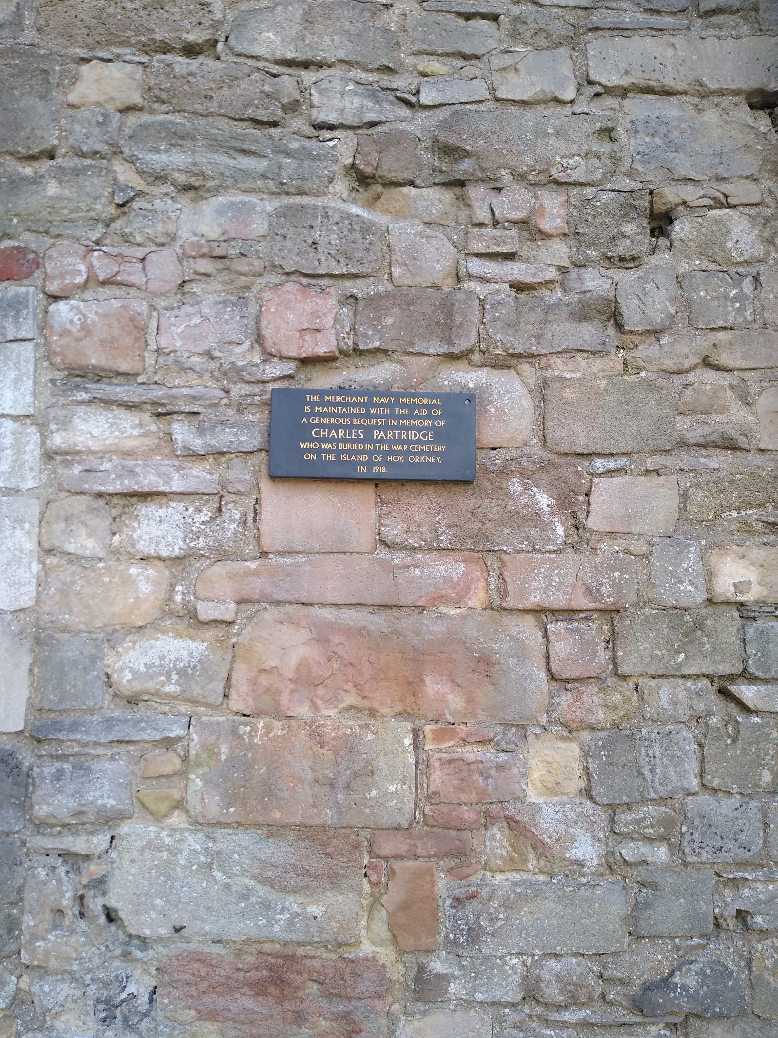 The Church of the Holy Rood is a medieval building, now a shell because of bombing in the Second World War. It has been maintained like this, instead of being swept away, and remains as a monument to those in the merchant navy who lost their lives at sea. In the corner is mounted a plaque – “This memorial is maintained with the aid of a generous bequest in the memory of Charles Partridge who was buried in the war cemetery on the island of Hoy, Orkney in 1918”.